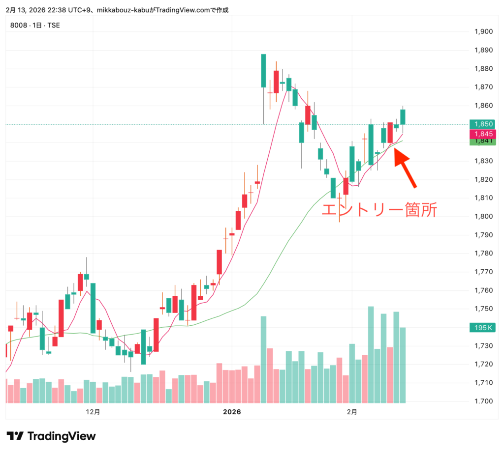 陰線 ⇨ 小陽線 出来高高い⇨出来高低い なら押し目としてはかなり良い形であった